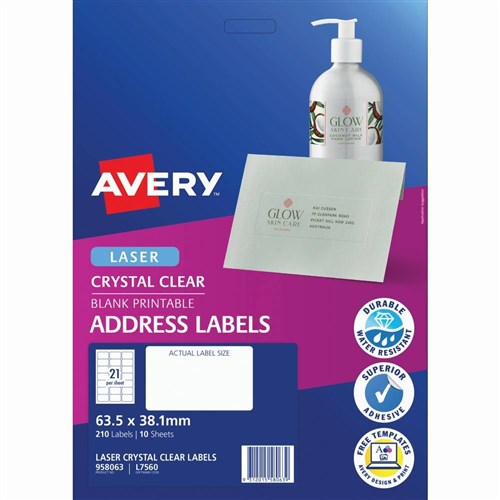 Avery Crystal Clear Laser Address Labels 63.5x38.1mm 21UP 210 Labels 10 Sheets