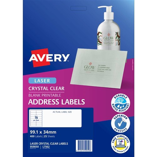 Avery Crystal Clear Laser Address Labels White L7562 99.1x34mm 16UP 400 Labels