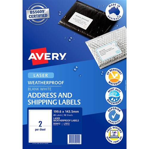 Avery Weatherproof Address & Shipping Laser White L7072 199.6 x 143.5mm 2UP 20 Labels
