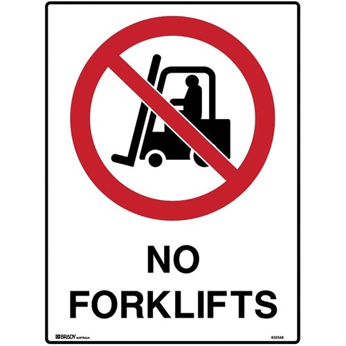 Brady Prohibition Sign No Forklifts 450W x 600mmH Metal White/Red/Black