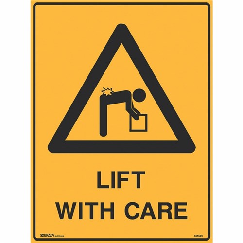 Brady Warning Sign Lift With Care 450W x 600mmH Metal Yellow And Black