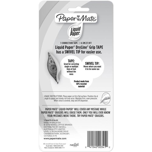 Paper Mate Liquid Paper Correction Tape Dryline Grip 5mm x 8.5m 60% Recycled
