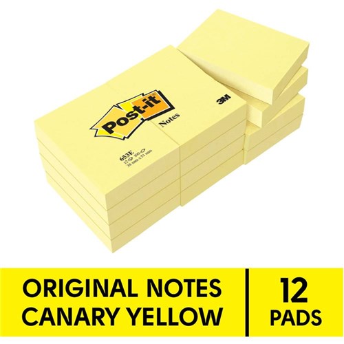 Post-It 653 Notes Original 38 x 50mm Yellow Pad 100 Sheets Pack of 12