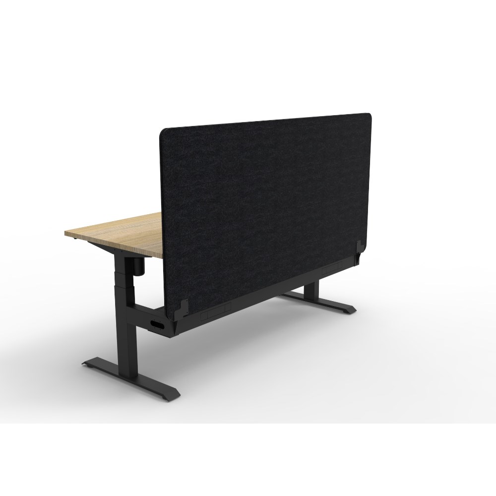 • Electric height adjustable single sided workstation with Natural Oak top and Black Satin frame, Black Eco screen and cable tray.