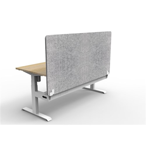 • Electric height adjustable single sided workstation with Natural Oak top and White Satin frame, Grey Eco screen and cable tray.