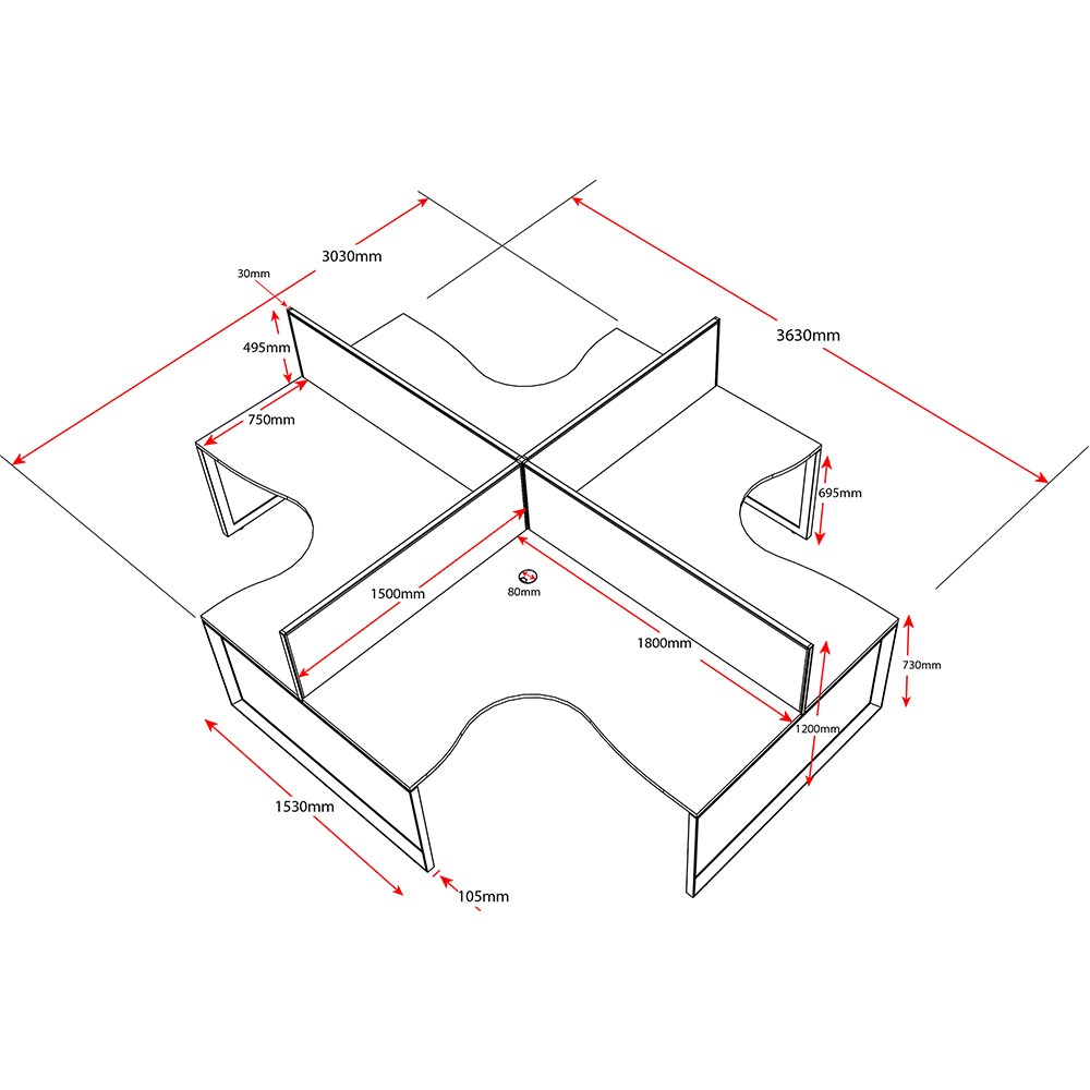 • Overall Including Screen: 3630mm W x 3030mmW x 780mm D x 1200mm H. Per User: 1800mm W x 1500mmW x 750mm D. Desk Height: 730mm.