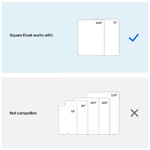 • Square Kiosk can run off your iPad battery. Compatible with: iPad (10th generation), iPad Air (4th and 5th generation), iPad Pro 11 inch (1st, 2nd, 3rd, and 4th generation) and iPad Air 11 inch M2. iPad not included.