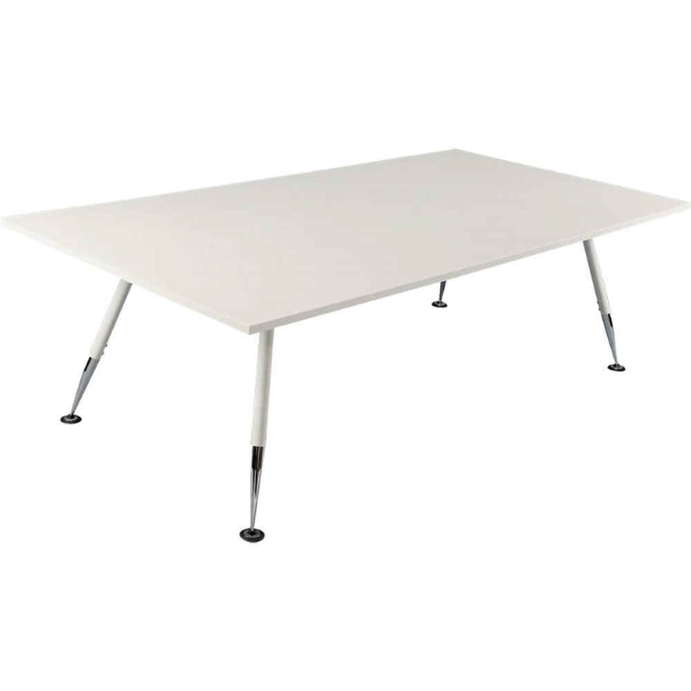 • A modern and elegant boardroom table with white top, white powder coated legs and chrome feet.