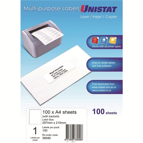Unistat Laser Copier & Inkjet Labels 297x210mm Back Slit 1UP 100 Labels 100 Sheets