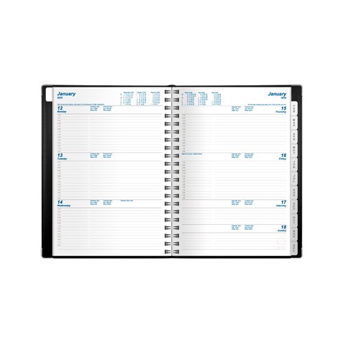• Double wire binding. Lay flat opening. Ribbon marker. Tabs. Translucent pocket.